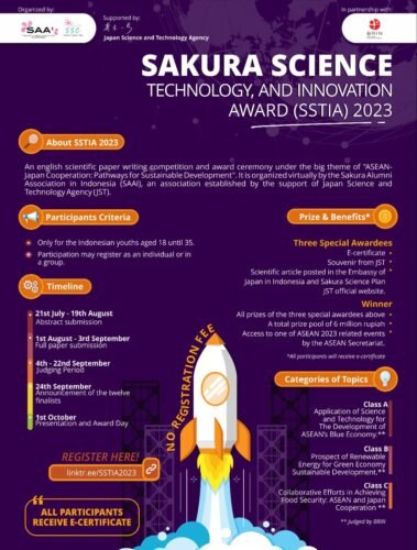 Sakura Alumni Association Indonesia (SAAI) menggelar Lomba penulisan Ilmiah. Lomba karya tulis sains ini merupakan rangkaian acara Sakura Science, Technology, and Innovation Award (SSTIA) 2023. Acara didukung oleh Japan Science and Technology Agency (JST).