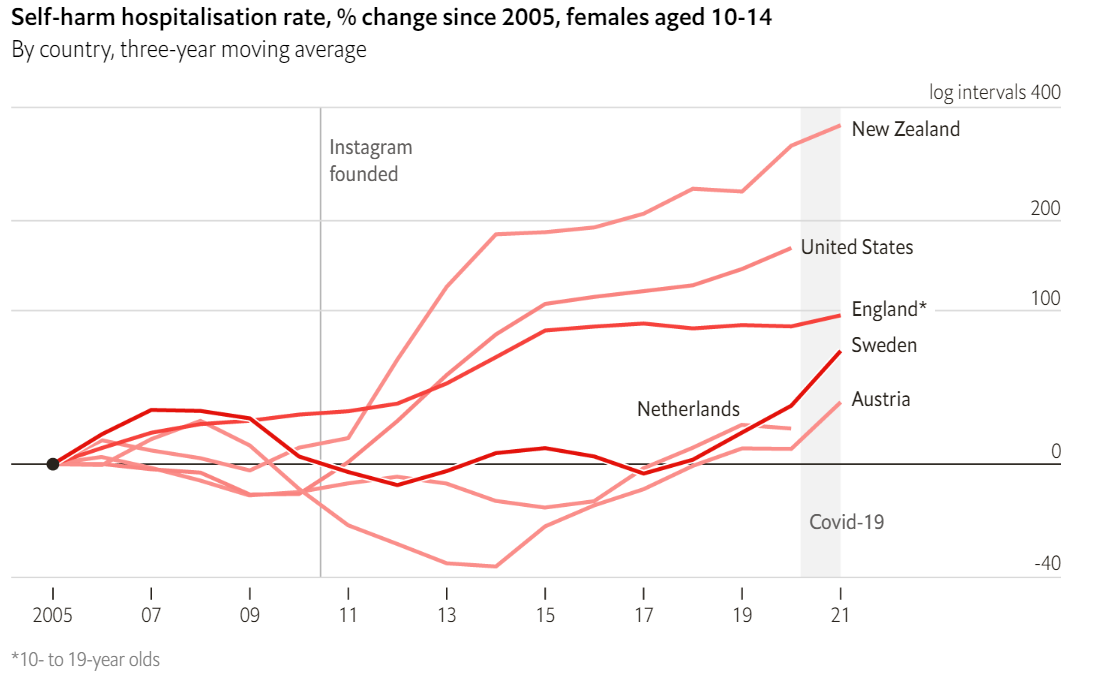 Untuk remaja perempuan, tingkat rawat inap akibat menyakiti diri sendiri naik sejak 2010 di 11 negara, dengan rata-rata kenaikan sebesar 143%. Sementara itu, kenaikan rata-rata untuk anak laki-laki adalah 49%.