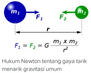 “Benda di alam semesta saling tarik menarik dengan gaya yang berbanding lurus dengan massa masing masing dan berbanding terbalik dengan kuadrat jarak antara mereka”.