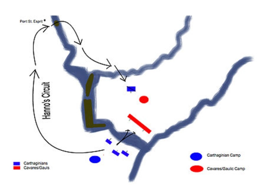 Untuk mengamankan penyeberangan, Hannibal memerintahkan Hanno (keponakan Hannibal) dan Korps nya melakukan penyeberangan dahulu di hulu sungai. Korps ini bertugas mengamankan proses penyeberangan dari timur sungai Rhones.