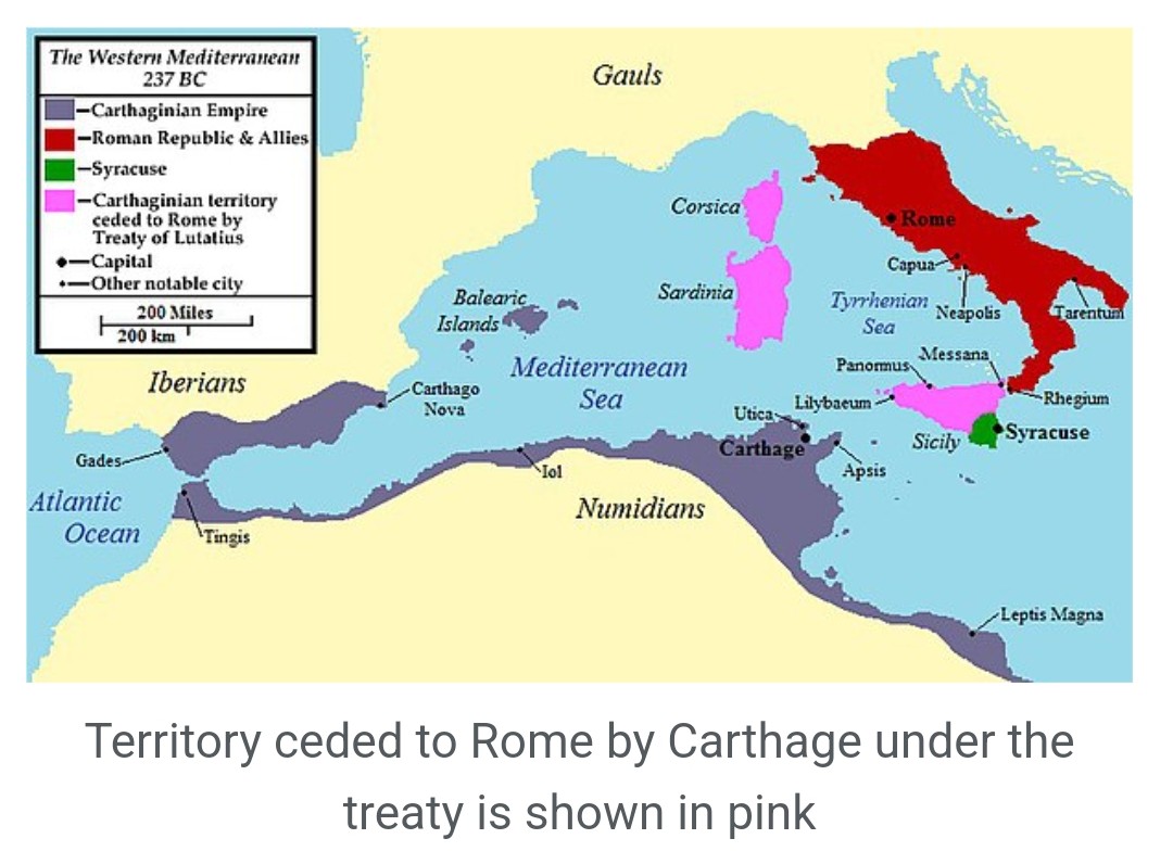 ● 241 SM : Kartago (Tunisia), yang saat itu menguasai perairan Mediterania, kalah dari Romawi, yang saat itu masih kecil, dalam Perang Punisia 1. Romawi merebut 3 pulau lumbung gandum yang semula dikuasai Kartago :
