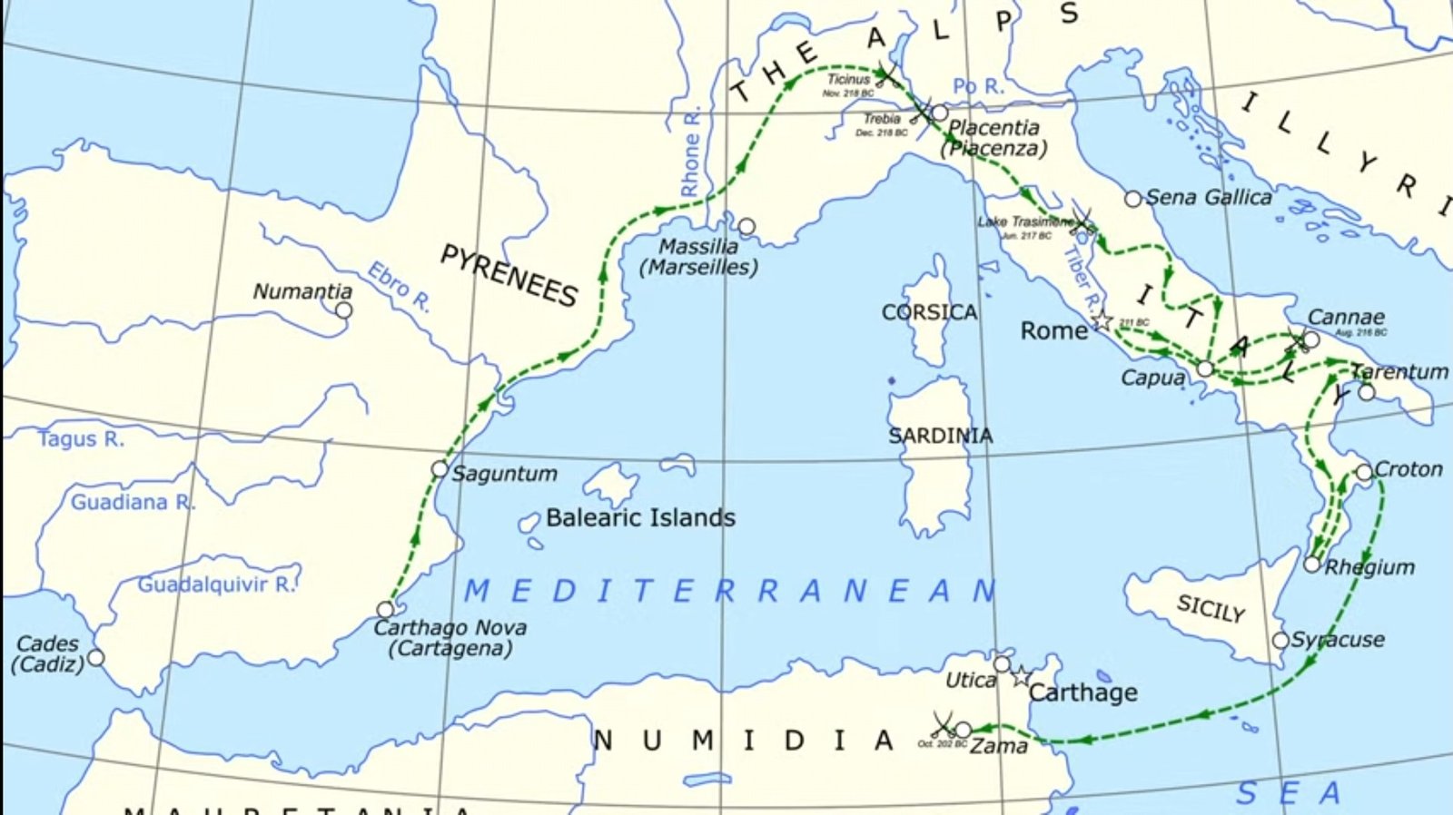 ● 219 SM : Hannibal menyerang dan menjarah kota Saguntum (pelabuhan dagang yang kaya), sekutu Roma, kemudian menyeberangi sungai Ebro