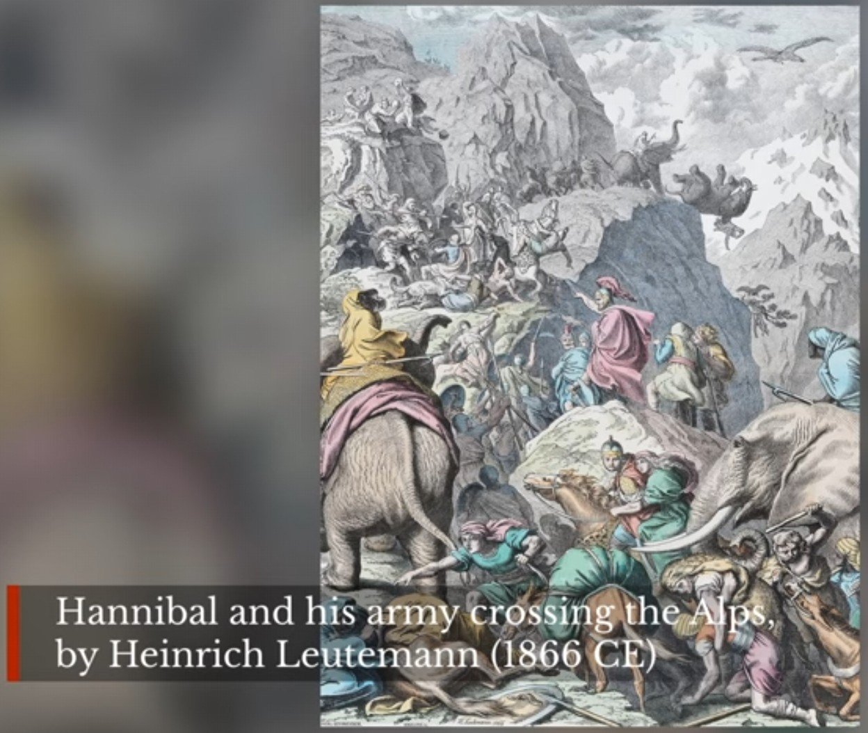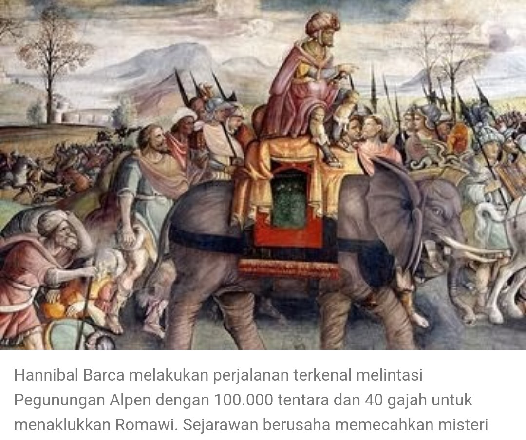 Dalam sejarah Perang Punisia antara Kartago dan Romawi (264 SM~146 SM), penggal Penyeberangan Jendral Hannibal Barca & 50.000 pasukannya dari Swiss melintasi pegunungan Alpen menuju Romawi bersama 40 gajah nya, adalah momen yang paling spektakuler. Kehadirannya di Romawi dan beberapa perang yang hampir selalu dimenangkannya, membuat teror yang menakutkan bagi seluruh warga Romawi. Strategi strategi cerdik Hannibal masih dipelajari di akademi² militer hingga sekarang.