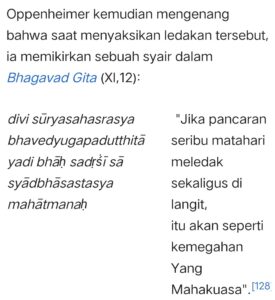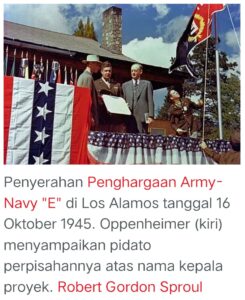 “Menentang pengembangan Bom Hidrogen. Oppenheimer disingkirkan dengan mengangkat isu kedekatannya dengan para aktivis Partai Komunis, lama sebelum proyek Bom Atom dikerjakan”.