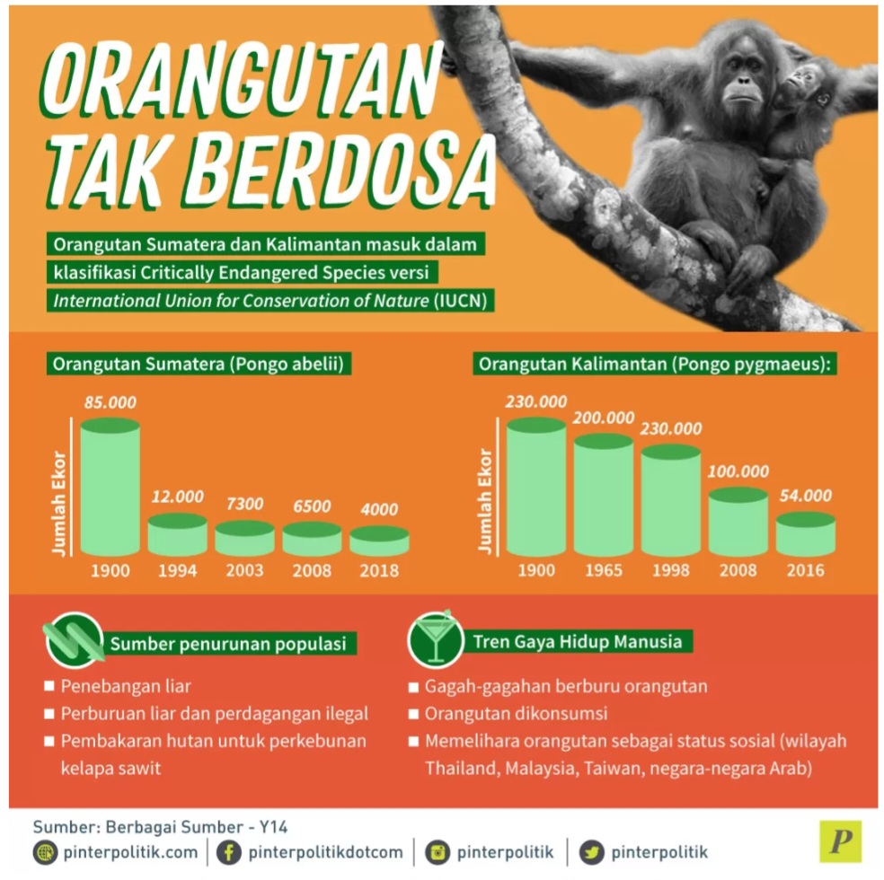 - Populasi Orangutan Kalimantan turun dari 230.000 menjadi 54.000 ekor.