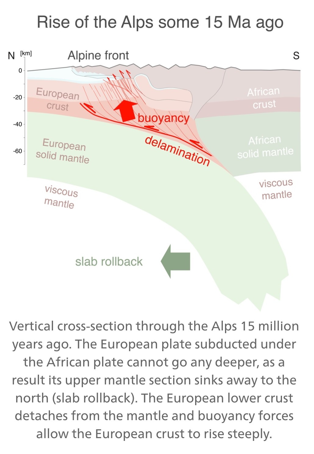 Hasil penelitian menunjukkan bahwa batuan Kristal Ringan di Lempeng Eropa bagian Atas tidak ikut tersubduksi (menunjam masuk) ke bawah Lempeng Afrika, tetapi terlepas dari Lempeng Eropa bagian Bawah. Akibatnya Lempeng Atas terdorong kembali ke permukaan bumi sehingga membentuk formasi vertikal yang menjulang tinggi. Lempeng Atas Eropa yang terlepas dari Lempeng Bawah nya ini berketebalan 25 km. Artinya, dari 100 km ketebalan Lempeng Eropa, 25 km teratas terlepas dan yang 75 km menunjam masuk ke bawah lempeng Afrika. Peristiwa ini mulai terjadi ± 15 juta tahun silam.