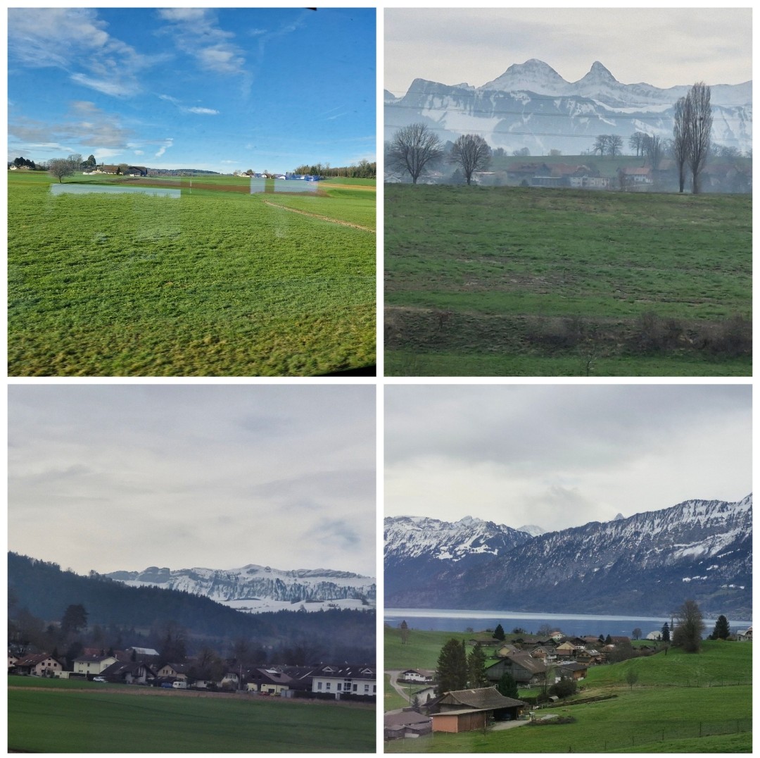 Sampai jam 10.15 kami tiba di kota Lausanne. Kami menunggu 40 menit untuk berganti kereta menuju Interlaken. Meskipun mengantuk karena kurang tidur, namun pemandangan nan indah sepanjang Lausanne – Interlaken membuat mata kami selalu terjaga. Udara bersih, lahan pertanian pedesaan tersusun rapi & di cakrawala menjulang tinggi puncak Alpen yang selalu tertutup salju.