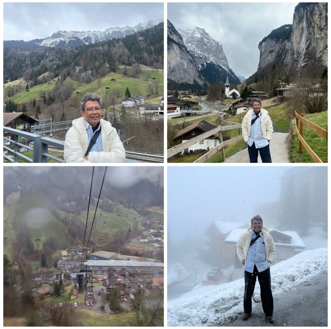 Esoknya, kami menikmati sensasi hujan salju di Murren, lereng Alpen yang ketinggiannya baru 860 meter dpl. Ke Maurren, kami naik Gondola. Mau naik gondola ke Top of Europe (3.450 meter dpl), posisi bangunan tertinggi di Eropa, tidak kesampaian, tidak memungkinkan karena sedang dilanda badai. Gak papa.
