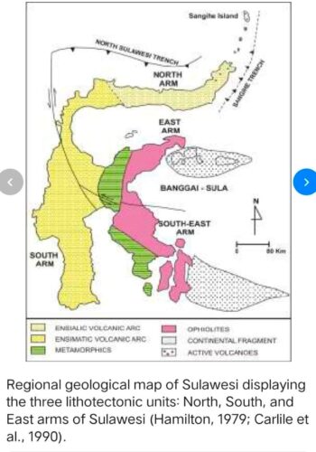 Sulawesi menjadi salah satu wilayah geologis yang paling rumit di dunia. Sulawesi bagian Barat dan Utara banyak gunung berapi. Sedangkan Sulawesi bagian Timur, tidak ada sisa² vulkanisme, tapi lebih kaya mineral.