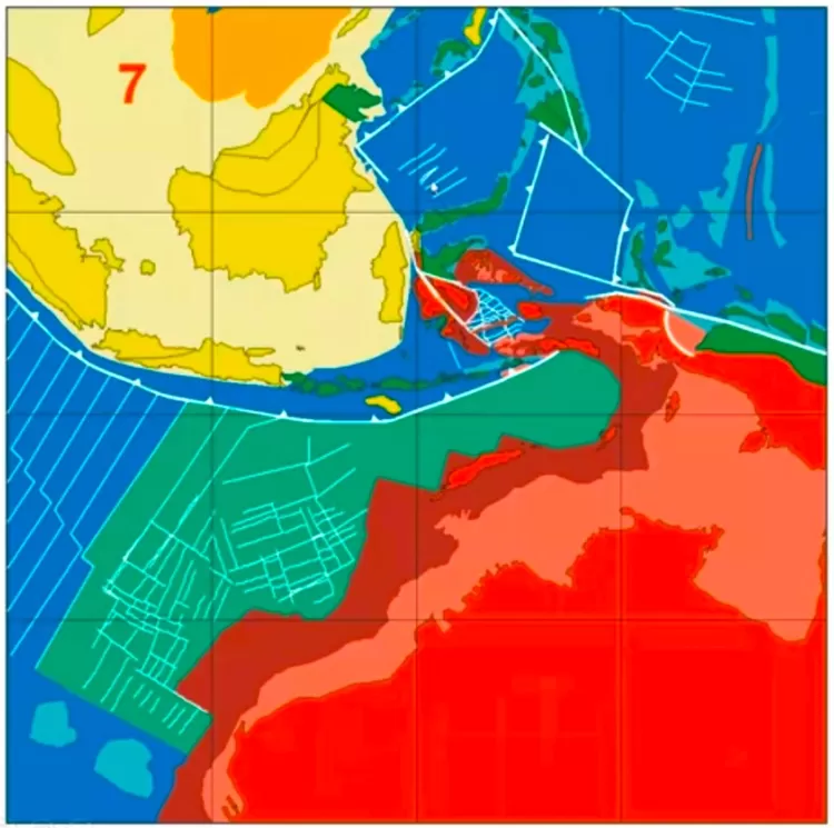 Proses tumbukan antar apungan benua terus terjadi dan daratan baru tersebut bergerak mendekat ke arah Kalimantan, kemudian berhenti.