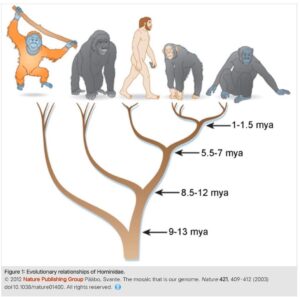 Manusia punya satu nenek moyang bersama dengan Bonobo pada ± 6,5 juta tahun yang lalu. Baru pada 5 juta tahun kemudian, Bonobo & Simpanse terspesiasi (berpisah spesies).