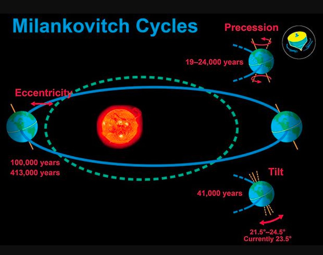 2. Adanya siklus kemiringan sumbu poros bumi (lihat gambar Tilt). Bergesernya kemiringan sumbu poros bumi ini antara 21,5° sampai 24,5°. Saat ini sudut poros kemiringan bumi 23,5°. Siklus pergeseran sudut poros ini sekitar 41.000 tahun.