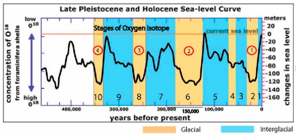 Siklus temperatur Bumi mengakibatkan siklus naik – turun nya tinggi permukaan air laut sebagai berikut :