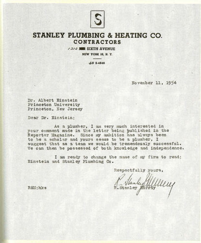 Serikat tukang ledeng Chicago segera menawari fisikawan terkenal itu keanggotaan. Plumbers and Steamfitters Union di Washington DC menjadikannya anggota kehormatan, yang membuat Einstein bisa juga disebut sebagai tukang ledeng. Stanley Murray, tukang ledeng New York, menulis kepadanya: “Karena saya bercita-cita menjadi sarjana dan anda bercita-cita menjadi tukang ledeng, saya pikir kita bisa menjadi sebuah tim yang sangat sukses. Kita akan memiliki baik pengetahuan maupun kemandirian. Saya siap mengubah nama perusahaan saya menjadi: Einstein and Stanley Plumbing Co.”